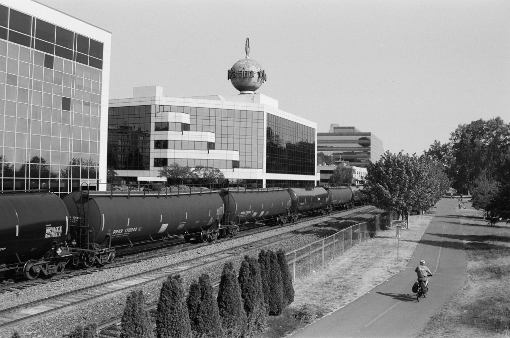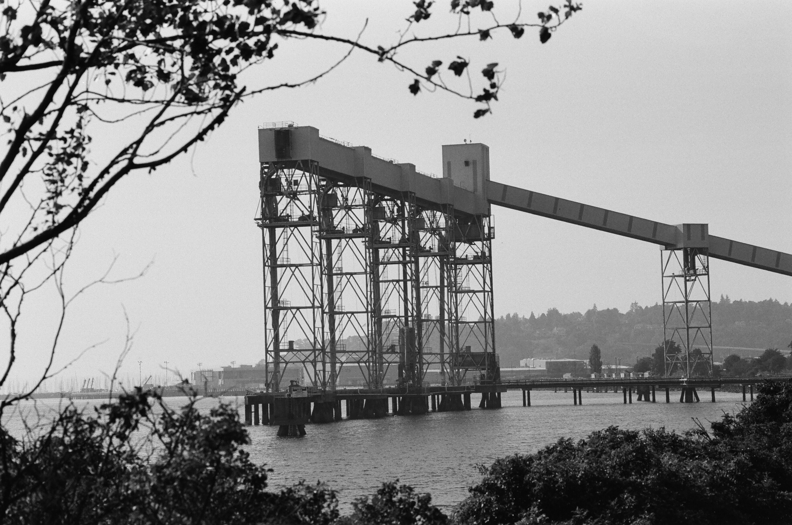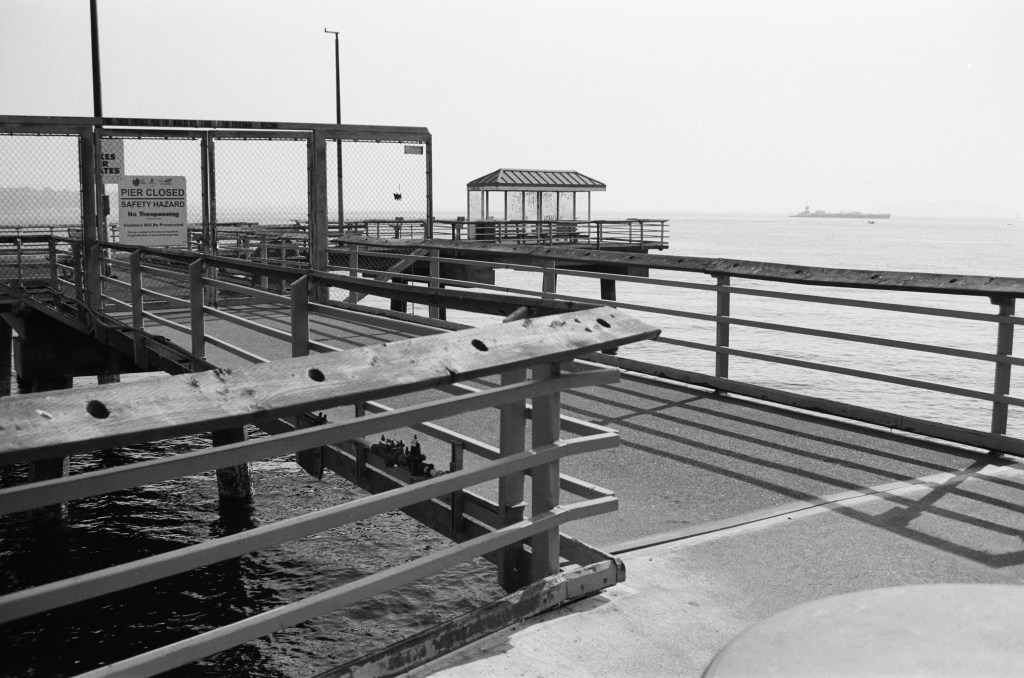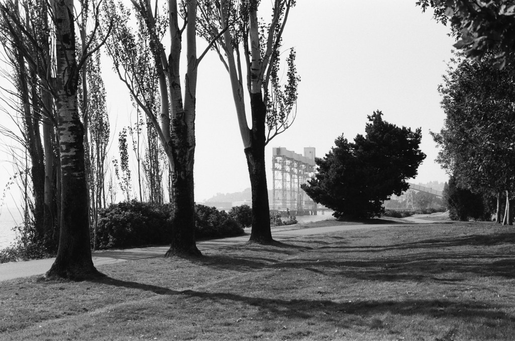 Hot and hazy conditions over Elliott Bay from summer wildfires. Shot with a Nikon N90s on Kodak Tri-X 400.